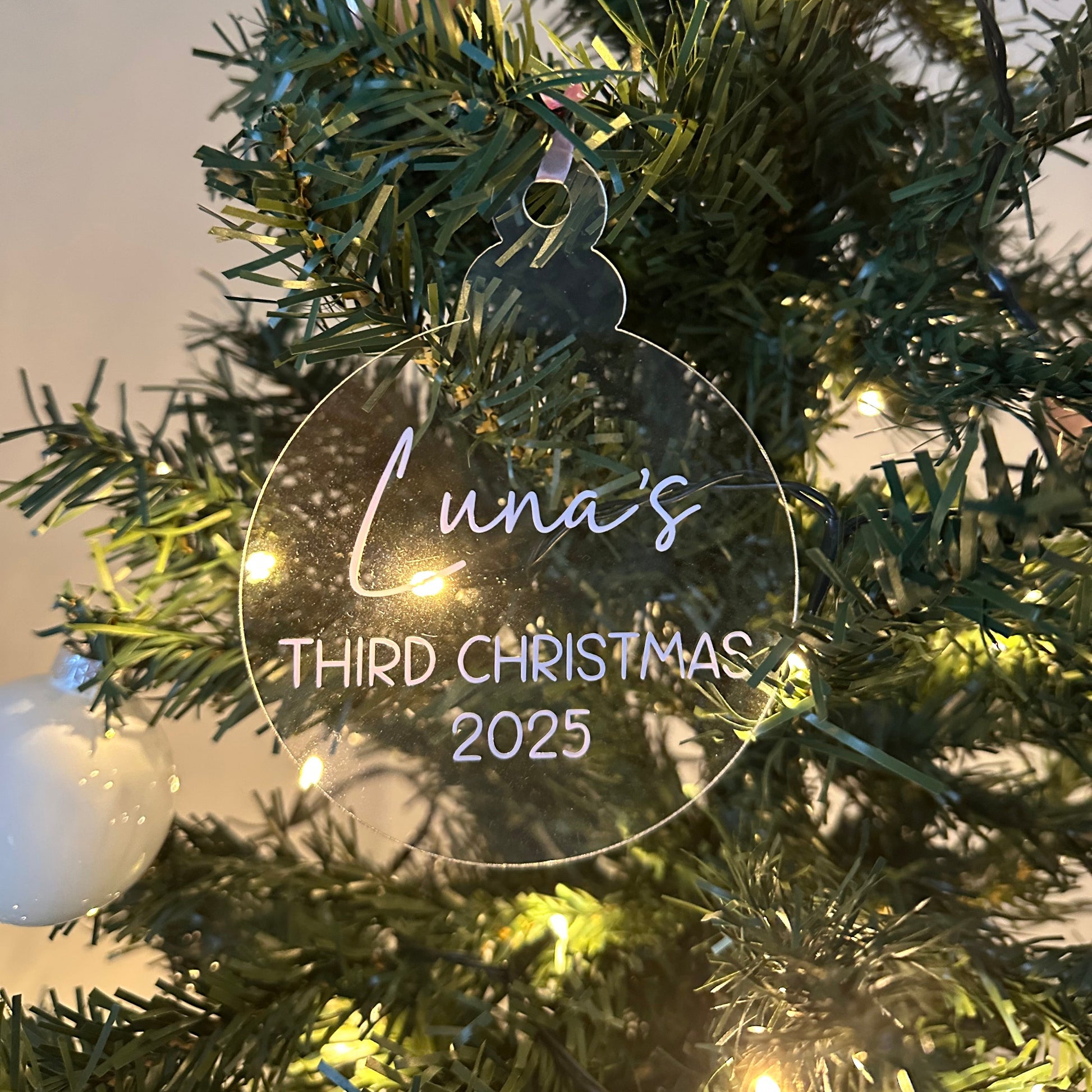 Unser eleganter Acrylglas-Baumanhänger (Ø 10 cm) wird individuell mit deinem gewünschten Namen sowie dem 1., 2., 3. … Weihnachten gestaltet. Das klare, moderne Design macht ihn zu einer wunderschönen Erinnerung und einem besonderen Highlight am Weihnachtsbaum.
